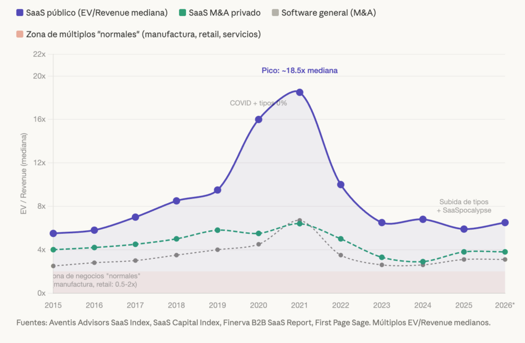 Entre 2015 y 2019, los múltiplos de valoración del SaaS público subieron de forma constante, pero dentro de rangos que aún se podían defender: 4-5x ingresos en el mercado de M&A privado, 8-10x en los mercados públicos. Alto respecto a cualquier otra industria, sí, pero con un argumento razonable detrás: ingresos recurrentes, alta predictibilidad, márgenes brutos del 70-85%.