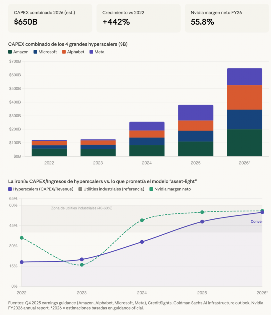 El CAPEX combinado de los cuatro grandes hyperscalers (Amazon, Microsoft, Google, Meta) pasó de $120.000 millones en 2022 a más de $650.000 millones previstos para 2026. Son cifras que no se parecen a nada visto en la historia de la tecnología. Los hyperscalers ahora dedican entre el 45% y el 57% de sus ingresos a inversión en infraestructura — ratios que se parecen más a utilities industriales que a empresas de software.
