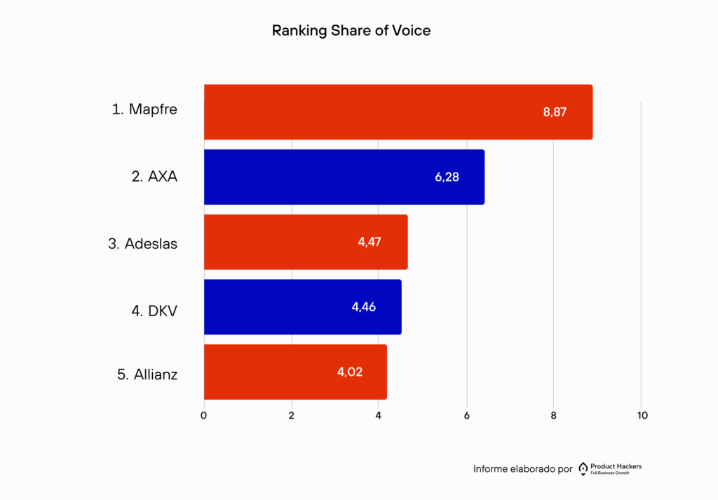 En el sector seguros en España, Mapfre lidera con un Share of Voice del 8,87%, seguida por AXA (6,28%), Adeslas (4,47%), DKV (4,46%) y Allianz (4,02%). Estas cinco aseguradoras forman la «primera división» de la visibilidad en IA (análisis propio, Product Hackers, 2026).